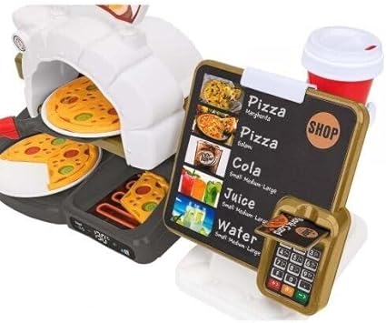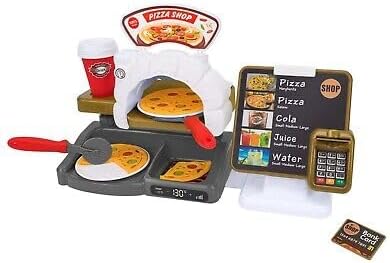 Kids Pizza Shop Playset with Toy Kitchen, Menu Board, Pizza Accessories and Drinks, Role Play Game