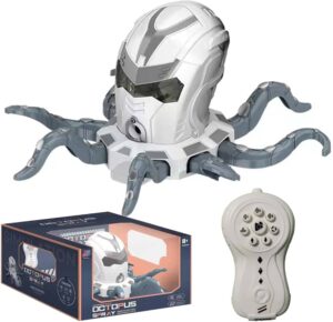 Enter a new dimension of robotic play with this fascinating remote-controlled octopus toy. Featuring a striking white and grey colour scheme, this futuristic robot combines the sleek aesthetics of a sci-fi helmet design with the versatile movement capabilities of an octopus. The detailed robotic head houses sophisticated controls that animate its multiple articulated arms, creating unique and engaging play possibilities. The intuitive remote control features multiple buttons for precise movement control, allowing young inventors aged 8 and above to master various motion patterns. This innovative toy merges creative design with interactive play, making it an excellent choice for children interested in robotics and mechanical creatures. The distinctive combination of the helmet-styled head unit and mechanical tentacles creates an imaginative play experience that’s both entertaining and engaging. Perfect for inspiring young minds and providing hours of creative entertainment.