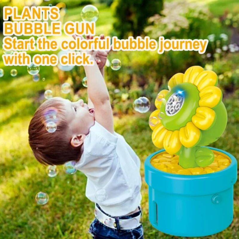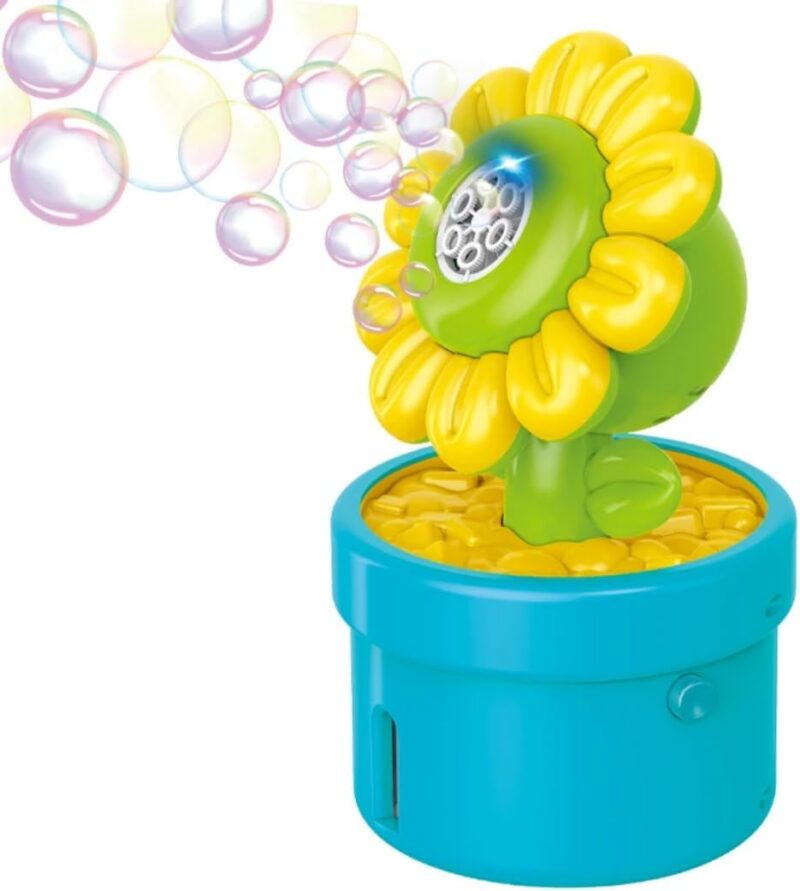 - DESIGN: Charming flower-shaped bubble machine in bright yellow and green colours with a turquoise base pot, perfect for outdoor entertainment